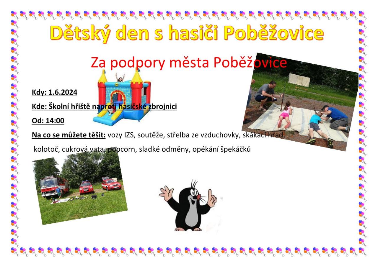 SDH Poběžovice ve spolupráci s městem Poběžovice zvou všechny malé i velké na oslavu Dětského dne, který se bude konat v pátek 21.6.2024 od 16:00 hodin na školním hřišti naproti Hasičské zbrojnici v Poběžovicích.