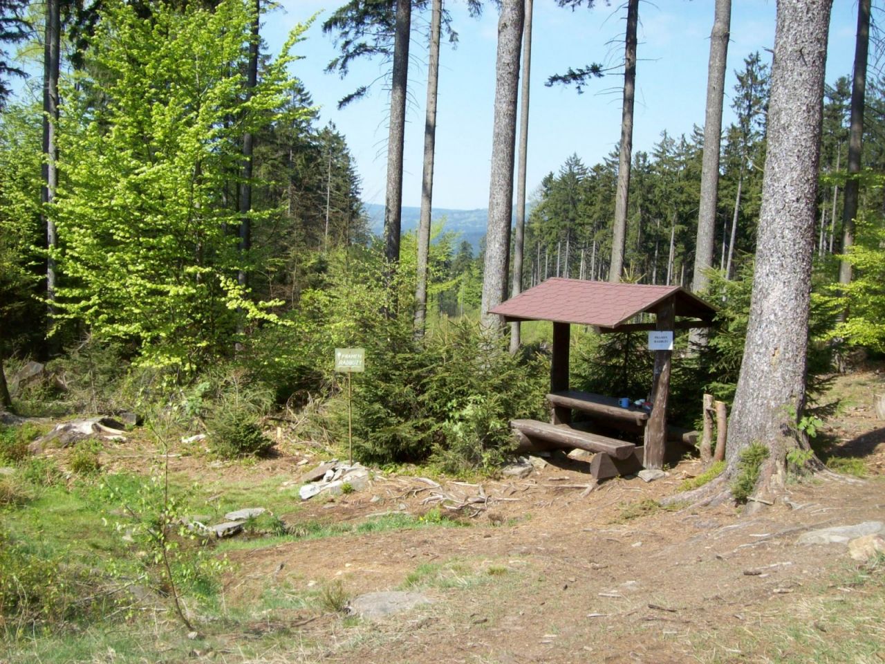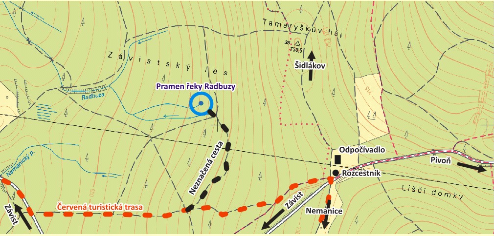 Pramen s odpočívadlem je od křižovatky Liščí domky vzdálen přibližně 500 m a trasa k němu je značena jak od tohoho rozcestí, tak od vsi Závist. Radbuza protéká obec Rybník a dále pokračuje na sever úzkým údolím ke vsi Smolov. V Chodské pahorkatině u Bělé nad Radbuzou se stáčí k východu a poté na jihovýchod k Horšovskému Týnu. Dále pokračuje na severovýchod přes Staňkov, Holýšov, Stod a Dobřany až do Plzně, kde ve Štruncových sadech ústí zprava do řeky Mže. Spolu s Mží, Úslavou a Úhlavou tvoří Radbuza zdrojnici řeky Berounky. Radbuza je spolu se Mží hydrologicky a vodohospodářsky nejvýznamnější řekou Českého lesa.