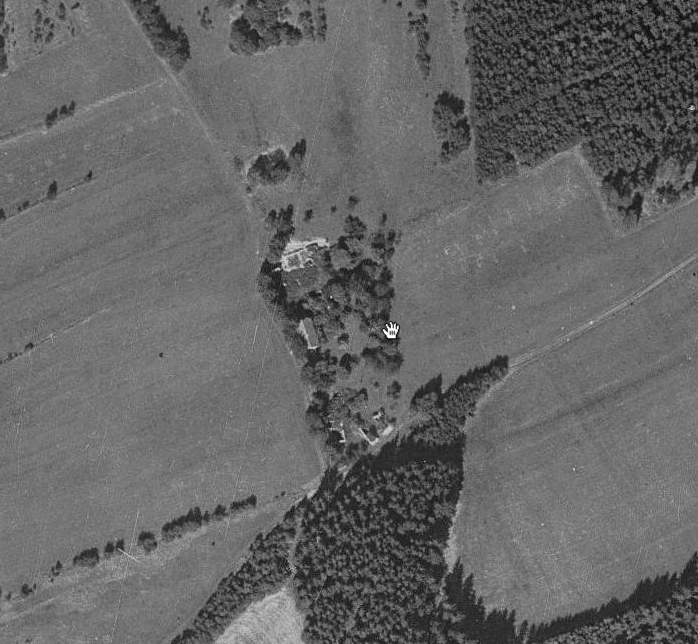 Vyhlídka na leteckém snímku z roku 1947 Osada stojící jižně od obce Rybník.