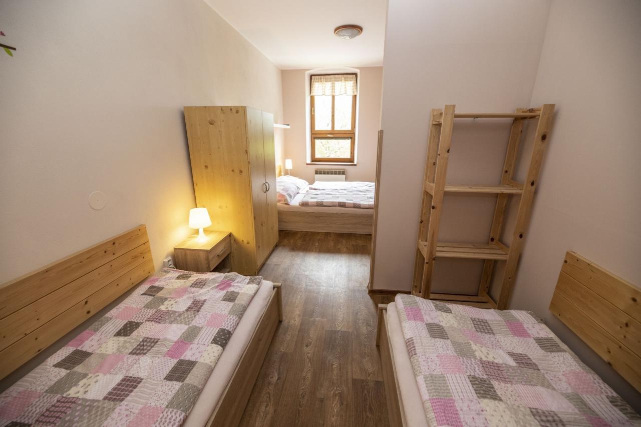 Všechny naše pokoje jsou umístěné v prvním patře a jsou vybavené vlastním sociálním zařízením se sprchovým koutem (ručník a osuška) a wifi připojením zdarma. Na chodbě před pokoji je k dispozici společná lednice (apartmány mají lednice vlastní) a menší knihovna.